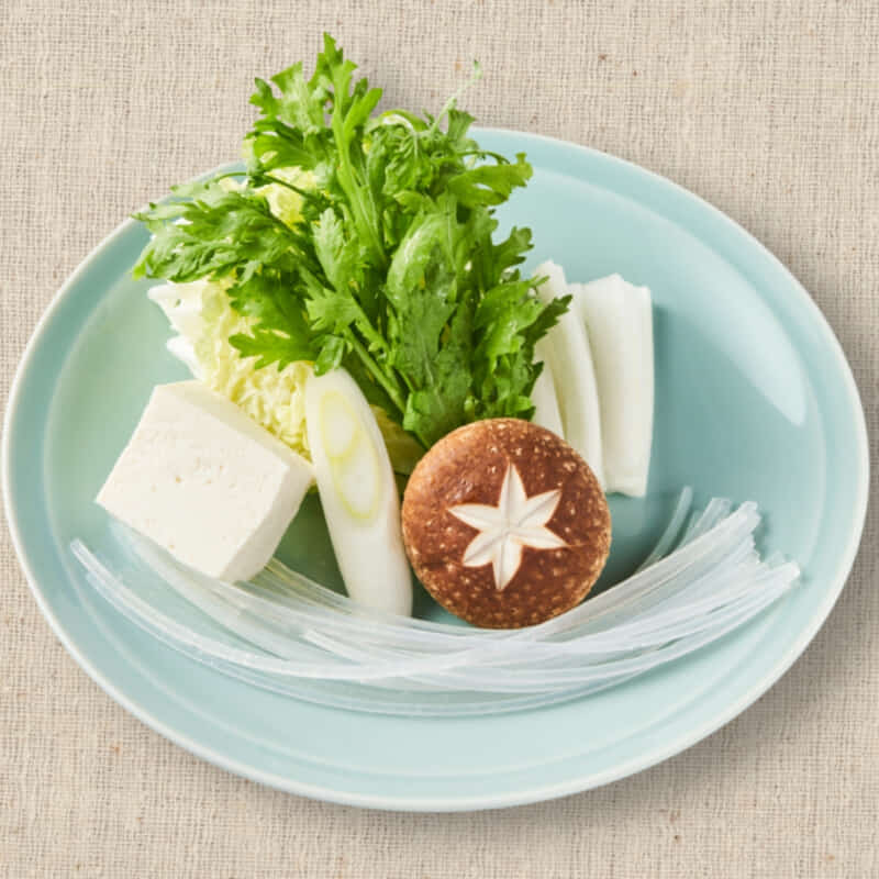 お好みの具材をお鍋に追加してください♪「野菜盛り合わせ」白菜、椎茸、ネギ、豆腐、くずきり